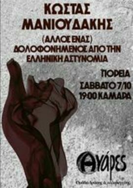 Την Παρασκευή 1 Σεπτεμβρίου, μπάτσοι της ΤΑΕ Σούδας σταματάνε τον Κωστή Μανιουδάκη σε επαρχιακό δρόμο. Εφευρίσκοντας μία πρόφαση, οι αστυνομικοί τον συλλαμβάνουν, τον δέρνουν και τον βασανίζουν με συνέπεια να καταρρεύσει και στη συνέχεια να χάσει τη ζωή του. Ακολουθεί η συνηθισμένη τακτική συγκάλυψης κράτους-ΜΜΕ που μιλούν για "κατάρρευση τη στιγμή ενός τυχαίου ελέγχου" και η ανακοίνωση των δολοφόνων του Κωστή (Αστυνομικοί Χανίων), που λίγο πολύ απειλούν όποιον τολμήσει να ανοίξει την υπόθεση.