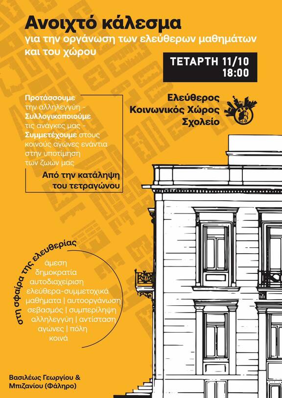 Για όλους αυτούς τους λόγους, σας καλούμε στον χώρο του Ελεύθερου Κοινωνικού Χώρου Σχολείο, όπου θα πραγματοποιηθεί αυτοπαρουσίαση του εγχειρήματος, των πολιτικών και κοινωνικών προεκτάσεων του, θα συζητήσουμε όλοι και όλες μαζί σχετικά με τη λειτουργία του χώρου και των δραστηριοτήτων, θα προτείνουμε την δημιουργία/συνέχιση μαθημάτων και δομών, θα ζυμωθούμε και θα σχεδιάσουμε την νέα "σχολική χρονιά".