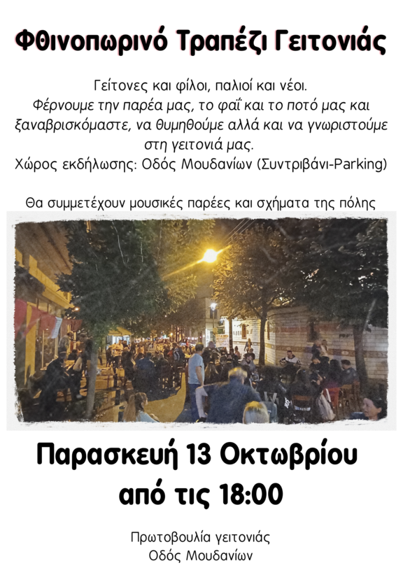 Φίλοι και γείτονες, νέοι και παλιοί, σε μια προσπάθεια να ξαναβρεθούμε, να θυμηθούμε και να γνωριστούμε, διοργανώνουμε την Παρασκευή 13 Οκτωβρίου, από τις 18:00 το απόγευμα μέχρι το βράδυ, το 2° "Τραπέζι στη Γειτονιά".