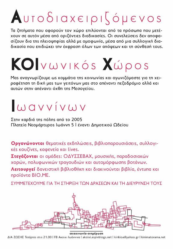 Κάθε Τετάρτη πραγματοποιείται η διαχειριστική συνέλευση του Αυτοδιαχειριζόμενου Κοινωνικού Χώρου Ιωαννίνων.