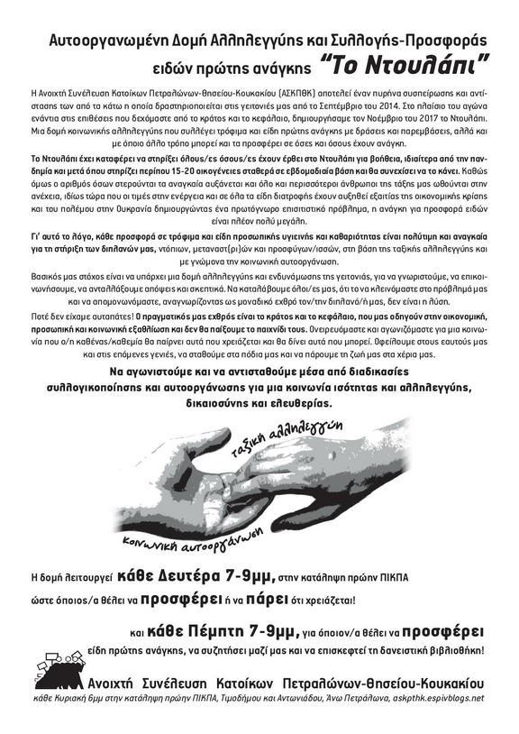 Εδώ και πεντέμισι χρόνια, στα πλαίσια της κάλυψης των βασικών αναγκών και της καλλιέργειας της αλληλεγγύης στις γειτονιές μας, η Ανοιχτή Συνέλευση Κατοίκων Πετραλώνων-Θησείου-Κουκακίου δημιούργησε ένα χώρο, μέσα στην κατάληψη πρώην ΠΙΚΠΑ, συλλογής ειδών πρώτης ανάγκης, σωματικής υγιεινής, καθαριστικών, τροφίμων και προσφοράς τους σε όσους/ες έχουν ανάγκη.