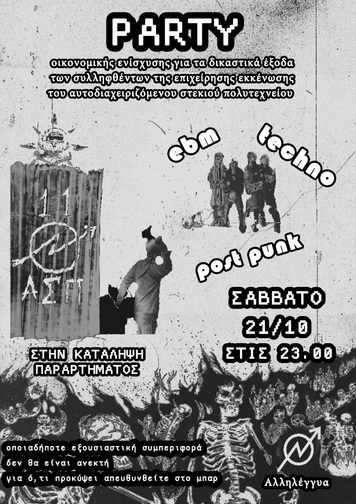 Σάββατο 21.10 μετά τις 23.00 . Party οικονομικής ενίσχυσης για τα δικαστικά έξοδα των συλληφθέντων από την επιχείρηση εκκένωσης του Αυτοδιαχειριζόμενου στεκιού Πολυτεχνείου. Εξουσιαστικές συμπεριφορές δεν θα γίνουν ανεκτές, για ό,τι προκύψει απευθυνθείτε στο μπαρ.