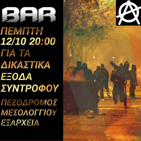 Bar για τα δικαστικά έξοδα συντρόφου, στον πεζόδρομο της Μεσολογγίου στα Εξάρχεια, την Πέμπτη 12 Οκτώβρη στις 20:00.