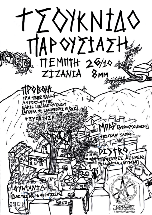 Approaching a year of political ferment and comradely coexistence, tsouknides wanted to introduce ourselves to you! So, trying to resist the impersonal exposure of the internet, we choose to meet in person, share our political thoughts and discuss. In this context we chose to show the documentary "If a tree falls, a story of the earth liberation front" as the struggles it presents offer (us) inspiration and we consider important the history of direct ecological action. At the same time, we will exhibit a distro with brochures that have troubled us fruitfully, printed materials from actions we participated in and our self-presentational text. Of course, there will be nettle pies, beers, juices as well as pots with broccoli, carrots and other winter plants given out with advice on their care.