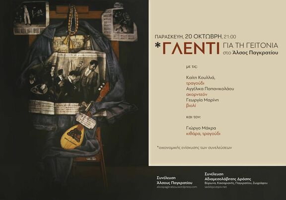 Η Συνέλευση του Άλσους Παγκρατίου μαζί με τη Συνέλευση Αδιαμεσολάβητης Δράσης Βύρωνα, Καισαριανής, Παγκρατίου, Ζωγράφου σας καλούν στο Γλέντι που συνδιοργανώνουν με την Καίτη Κουλλιά και την ορχήστρα της. Η εκδήλωση που θα πραγματοποιηθεί στην στρογγυλή πλατεία του Άλσους Παγκρατίου από τις 21:00 έως τη 01:00 θα κινηθεί ανάμεσα σε παραδοσιακά, έντεχνα και λαϊκά τραγούδια και θα περιλαμβάνει μπαρ και πολύ χορό.