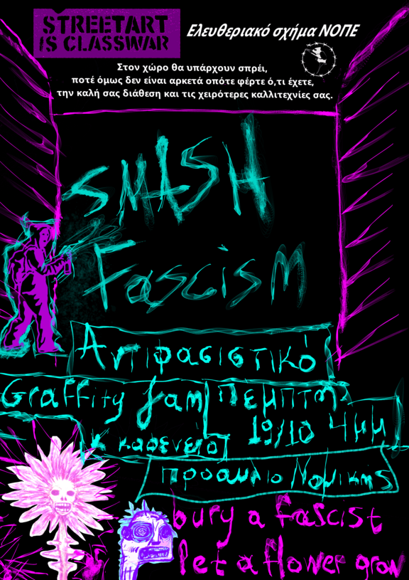 Σας καλούμε, λοιπόν, σε ένα graffity jam και καφενείο με σκοπό να πατήσουμε το άσπρο των τοίχων της σχολής που από κάτω κρύβει όλη αυτή την σήψη, και να γεμίσουμε έναν αποστειρωμένο χώρο με την παρουσία μας.