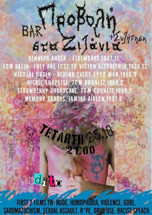 On Wednesday 25/10 at 21.00 we gather at the re-squatted social centre Zizania (Fylis&Feron), to watch together queer short documentary films and video art pieces.