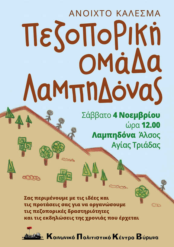 Πεζοπορική ομάδα Λαμπηδόνας: Το Σάββατο 4 Νοεμβρίου, στις 12 το μεσημέρι, καλούμε όλους τους φίλους, παλιούς και νέους στη Λαμπηδόνα, για να σχεδιάσουμε τις επόμενες δράσεις μας!