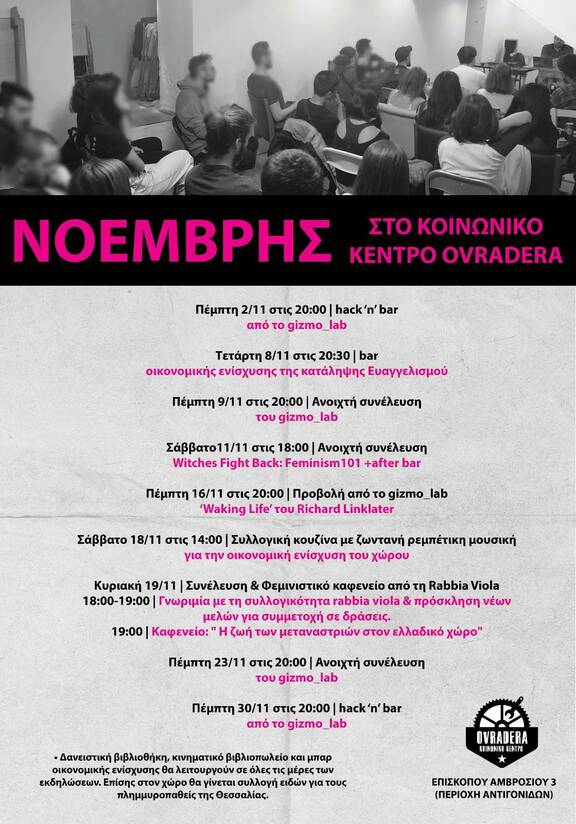 Συλλογική κουζίνα με ζωντανή ρεμπέτικη μουσική για την οικονομική ενίσχυση του χώρου. Σας περιμένουμε το Σάββατο 18 Νοεμβρίου στο κοινωνικό κέντρο Ovradera στην Επισκόπου Αμβροσίου 3 από τις 14:00 και μετά.
