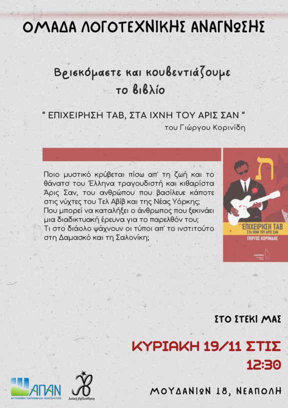 Διαβάζουμε το βιβλίο "Επιχείρηση Ταβ, Στα ίχνη του Άρις Σαν", του Γιώργου Κορινίδη και δίνουμε ραντεβού την Κυριακή 19/11 στις 12:30 για να το κουβεντιάσουμε!