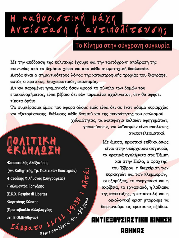 Επιθυμώντας να ανοίξουμε τη συζήτηση για την προοπτική του κινήματος αντίστασης στις σύγχρονες συνθήκες κυριαρχίας, οργανώνουμε εκδήλωση με τίτλο «Αντίσταση ή Αντιπολίτευση: Το Κίνημα στη Σύγχρονη Συγκυρία» στις 11 Νοέμβρη και ώρα 19:00 στον Ελεύθερος Κοινωνικός Χώρος «αλτάι»//Free Social Space "altai".