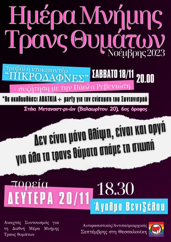 Καλούμε σε πορεία τη Δευτέρα 20 Νοέμβρη - Διεθνή Ημέρα Μνήμης Τρανς Θυμάτων,