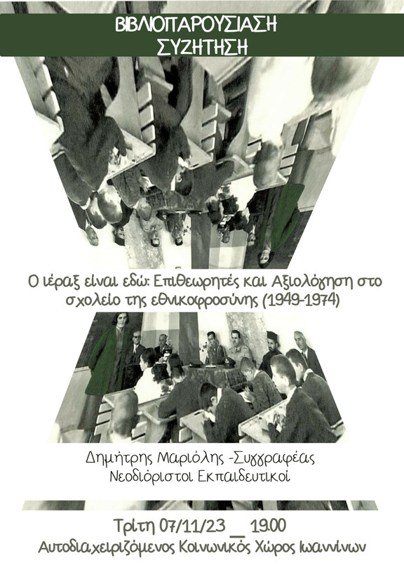 Την Τρίτη 7 Νοεμβρίου, φιλοξενούμε τον εκπαιδευτικό-συγγραφέα Δημήτρη Μαριόλη. Αφορμή για ακόμη μια συζήτηση γύρω από την αξιολόγηση στην εκπαίδευση αποτελεί το βιβλίο "Ο ιέραξ είναι εδώ-Επιθεωρητές και Αξιολόγηση στο σχολείο της εθνικοφροσύνης (1949-1974)".
