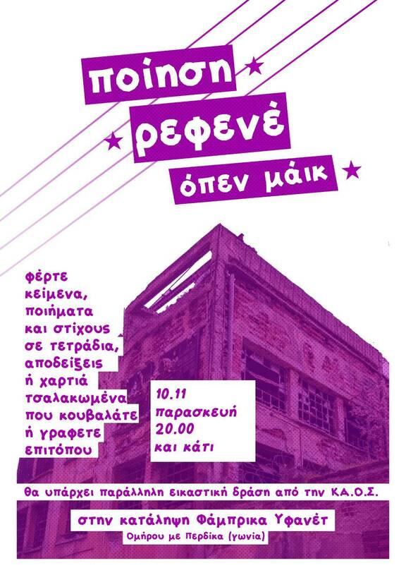 Μέσα ή έξω, σε χώρους κατειλημμένους, σε χώρους ανοιχτούς πάντα με όρους φροντιστικούς και συμπεριληπτικούς. μέχρι ένα σημείο όμως. δεν ανεχόμαστε πολλά και διάφορα, αυτά που δεν ανέχεστε κι εσείς. open mic γιατί όλα μπορούμε να σηκωθούμε (ή και όχι) και να πούμε, όταν (χρονικο-υποθετικό προφανώς) νιώσουμε άνεση και ασφάλεια. η ποίηση βέβαια είναι άβολη κάποιες φορές αλλά γι' αυτό βρισκόμαστε, να αποδομούμε πράγματα, να χτίζουμε νέα, παρέα. μη διστάσετε να αφήσετε ποίημα έντυπο στο κουτί μας για την «ποίηση ρεφενέ» συλλογή ποιημάτων που προκύπτει από εμάς για εμάς με ελεύθερη συνεισφορά για να καλύπτει τα έξοδά της. δε θα μας ξεφορτωθείτε τόσο εύκολα, η συνέλευσή «ποίηση ρεφενέ» είναι ανοιχτή σε συγκεκριμένο χώρο αλλά σε καθόλου συγκεκριμένο χρόνο. άμα ψάξετε στις γνωστές πηγές πληροφόρησης θα το μάθετε έγκαιρα όμως για να 'ρθείτε να συνεισφέρετε με ιδέες, συμμετοχή ή τις λέξεις σας.