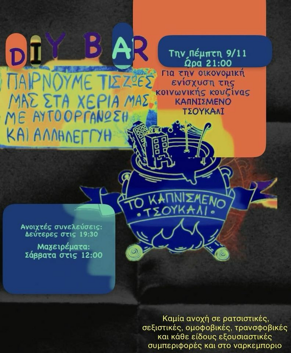 DIY BAR Την Πέμπτη 9/11 στις 21:00 για την οικονομική ενίσχυση των δράσεων της κοινωνικής κουζίνας "Το καπνισμένο τσουκαλι"