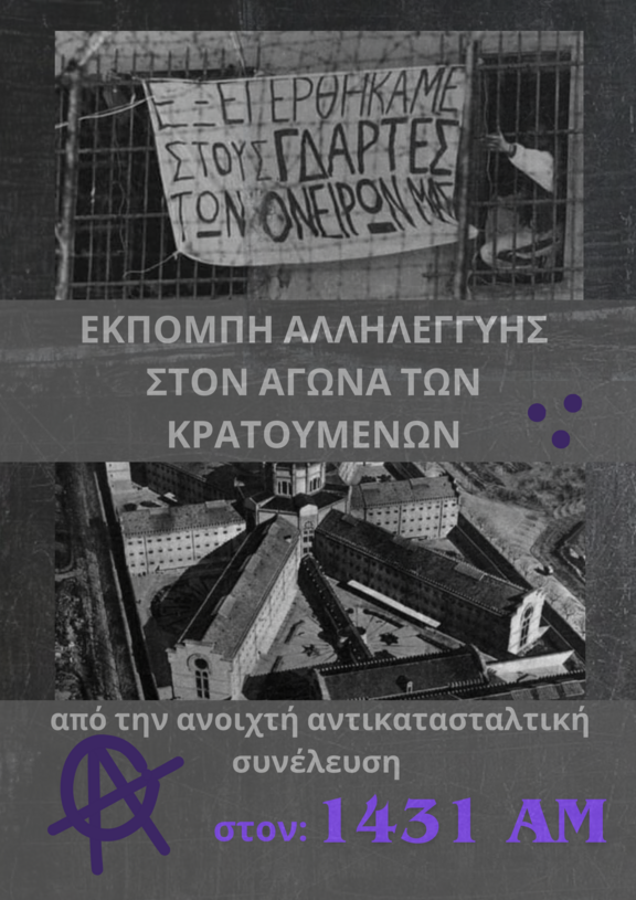 Συντονιστείτε κατά τις 19:00 μ.μ. στον 1431AM. Αλληλεγγύη σε όλα τα διωκόμενα συντρόφια. Μέχρι το γκρέμισμα της τελευταίας φυλακής.