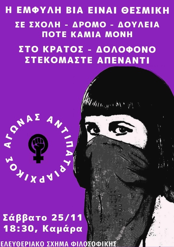Η πατριαρχική συγκρότηση της κοινωνίας καθιστά τη σεξουαλικοποιημένη βία κανονικότητα και επιβάλλει τη σιωπή, ενώ ο αγώνας για την απελευθέρωση από τα δεσμά της είναι αναπόσπαστο κομμάτι του αγώνα για το γκρέμισμα της κρατικής και καπιταλιστικής επιβολής.