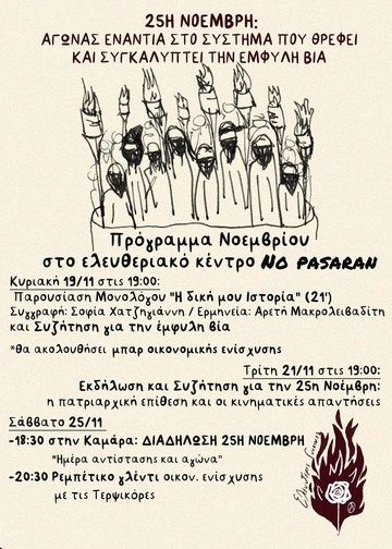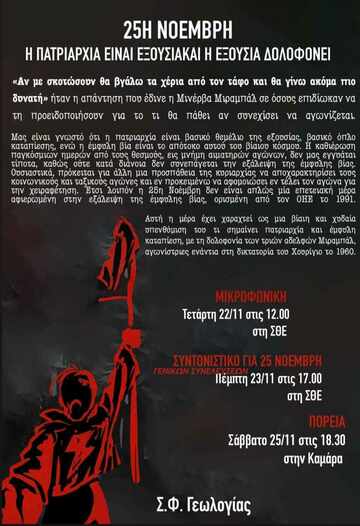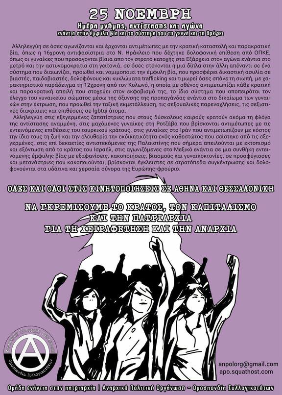 Η 25η Νοέμβρη θεσμοθετήθηκε από τον ΟΗΕ ως ημέρα για την εξάλειψη της βίας κατά των γυναικών. Η συγκεκριμένη μέρα έχει καθιερωθεί από το 1991, όταν γυναικείες οργανώσεις θέλησαν να τιμήσουν τη μνήμη των τριών αδελφών Μιραμπάλ από τη Δομινικανή Δημοκρατία που βασανίστηκαν, ξυλοκοπήθηκαν και στραγγαλίστηκαν μέχρι θανάτου, κατ' εντολήν του δικτάτορα Τρουχίλο, στις 25 Νοεμβρίου 1960. Η ημέρα αυτή -όχι επειδή μας ενδιαφέρει να περιχαρακώνουμε τον αγώνα μας ενάντια στην πατριαρχία σε μία ή δύο ημέρες το χρόνο- είναι ευκαιρία αποδόμησης και επανανοηματοδότησης, ευκαιρία να ανοίξει το ζήτημα της έμφυλης βίας στη πόλη και να συλλογικοποιηθούμε με σκοπό να αντιπαραθέσουμε τα δικά μας θέλω και προτάγματα. Είναι εξάλλου γνωστή τακτική του κράτους και θεσμικών φορέων να χρησιμοποιούν πολιτικά γεγονότα ανάγοντάς τα σε διεθνείς μέρες και γιορτές, σε μια προσπάθεια να αφαιρέσουν τα χαρακτηριστικά τους και να τα αποπολιτικοποιήσουν.Η έμφυλη βία, όμως, είναι καθημερινή και η οργή μας δεν χωράει σε καμία μέρα.