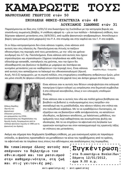 ΚΑΛΕΣΜΑ ΔΙΑΜΑΡΤΥΡΙΑΣ -Τετάρτη 11/01/2012 -2:30΄μμ στο τμήμα του Αγ. Παντελεήμονα & Πέμπτη 12/01 στις 9.00 π.μ στα δικαστήρια Ευελπίδων στη δίκη των μαχαιροβγαλτών του Αγ. Παντελεήμονα,