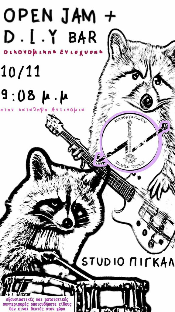 Την Παρασκευη 10/11 εχουμε οπεν τζαμ και d.i.y μπαρ , για την οικονομική ενίσχυση του στουντιου και του ανερχόμενου λαιβ.