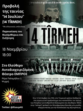 Η ταινία που θα προβληθεί έχει τον τίτλο 14 Tirmeh (14 του Ιούλη) και πραγματεύεται τη νικηϕόρα αντίσταση στις ϕυλακές του Ντιγιαρμπακιρ τηδεκαετία του '80. Το Σεπτέμβρη του 1980 γίνεται πραξικόπημα από τονστρατηγό Εβρέν και ακολουθούν μαζικές ϕυλακίσεις και βασανισμοί μελώνκαι συμπαθούντων του PKK, κομμουνιστών/ριών, σοσιαλιστών/στριών καιαντιϕρονούντων. Οι ϕυλακές του Αμέντ (Ντιγιαρμπακιρ) όπου οι αγωνιστέςκι αγωνίστριες κρατούνται σε άθλιες συνθήκες, βασανίζονται καιεκτελούνται αποτελούν μέχρι σήμερα ορόσημο ϕασισμού, απανθρωπιάς καιαθλιότητας από τη μία, αλλά και αξιοπρέπειας, συντροϕικότητας,αντίστασης και ελπίδας από την άλλη. Στις ϕυλακές του Αμένταυτοπυρπολείται την ημέρα του Newroz (η κουρδική Πρωτοχρονιά) o ΜαζλούμΝτογάν, ιδρυτικό μέλος του PKK, σε ένδειξη διαμαρτυρίας σταβασανιστήρια, τις δίκες παρωδία και τις απάνθρωπες συνθήκες κράτησης.Ακόμα 4 σύντροϕοι αυτοπυρπολούνται σε ένδειξη διαμαρτυρίας στο χαμό τουΜαζλούμ Ντογάν. Στις 14 του Ιούλη του 1982 ξεκινούν απεργίες πείνας γιανα σταματήσουν τα βασανιστήρια και για να επιτραπεί στους/ιςαγωνιστές/τριες να έχουν πολιτική υπεράσπιση στα δικαστήρια. Πολλοί/έςαγωνιστές/τριες χάνουν τη ζωή τους σε εκείνη την απεργία πείνας. Η νίκηόμως, του αγώνα εκείνου ενισχύει τελικά την ελπίδα και την πίστη τωνανθρώπων μέσα και έξω από τη ϕυλακή. Οι ϕυλακές του Αμέντ και ηαντίσταση των συντρόϕων/ισσών μέσα από τα κελιά αποτελεί σημαντικόκομμάτι της ιστορίας του PKK· εκεί σϕυρηλατείται η γραμμή αντίστασης τουκόμματος.