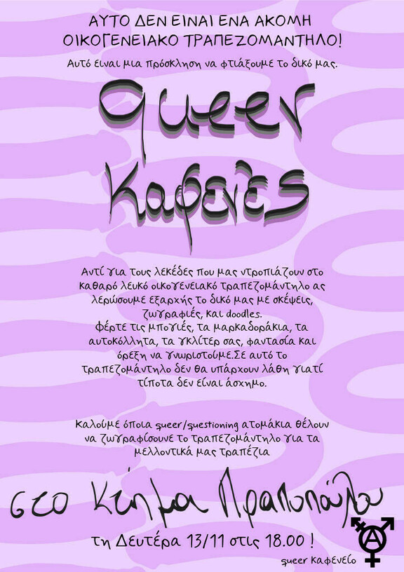 Καλούμε όποια queer/ questioning ατομάκια θέλουν να ζωγραφίσουν το τραπεζομάντηλο για τα μελλοντικά μας τραπέζια. Στο κτήμα πραποπούλου , τη δευτέρα 13/11 στις 18:00.