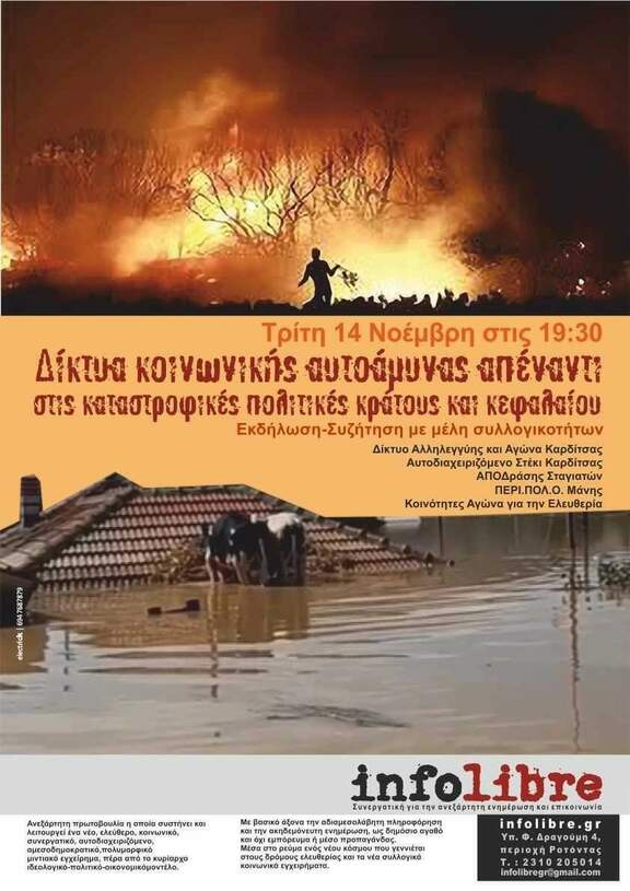 Με αυτές τις σκέψεις, σας προσκαλούμε στην εκδήλωση - συζήτηση «Δίκτυα κοινωνικής αυτοάμυνας απέναντι στις καταστροφικές πολιτικές κράτους και κεφαλαίου», την Τρίτη, 14/11, στις 19.30, στο χώρο του infolibre (υπ. Φ. Δραγούμη 4, περιοχή Ροτόντας, Θεσσαλονίκη), για να ενημερωθούμε από τις κοινότητες αγώνα που θα παρουσιάσουν τη δράση τους αλλά και να συζητήσουμε για την αυτοοργάνωση των δικών μας απαντήσεων απέναντι στη λεηλασία της φύσης, της ζωής και της κοινωνίας, μέσα από τη δικτύωση των αγώνων μας. Η συγκεκριμένη θα είναι η πρώτη ενός κύκλου εκδηλώσεων-συζητήσεων, το επόμενο διάστημα, που θα αφορούν όλες τις θεματικές της λεηλασίας και τα πεδία των αντιστάσεων. Ως συλλογικό εγχείρημα, μας εκφράζει το παρακάτω κείμενο που παρουσιάστηκε σε μια προσπάθεια να δημιουργηθεί μια δικτύωση κοινοτήτων αγώνα για την ελευθερία.