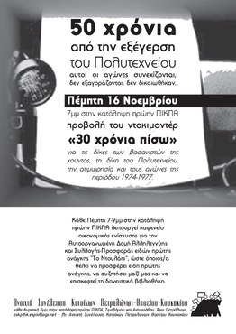 Πέμπτη 16 Νοεμβρίου στις 7µµ στην κατάληψη πρώην ΠΙΚΠΑ προβολή του ντοκιμαντέρ «30 χρόνια πίσω» για τις δίκες των βασανιστών της χούντας, τη δίκη του Πολυτεχνείου, την ατιμωρησία και τους αγώνες της περιόδου 1974-1977.