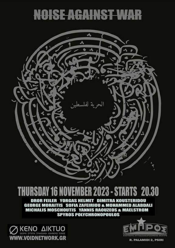 ΚΕΝΟ ΔΙΚΤΥΟ- NOISE AGAINST WAR- Αντιπολεμικό φεστιβάλ avant-garde, πειραματικής και θορυβικής μουσικής αφιερωμένο στα θύματα της καταστροφής της Παλαιστίνης που συντελείται αυτή τη στιγμή- Πεμ. 16 Νοεμβρίου 2023- ώρα 20.30- Ελεύθερο Αυτοδιαχειριζόμενο Θέατρο ΕΜΠΡΟΣ (Ρ. Παλαμήδη 2, Ψυρρή) Είσοδος δωρεάν με ελεύθερη συνεισφορά.