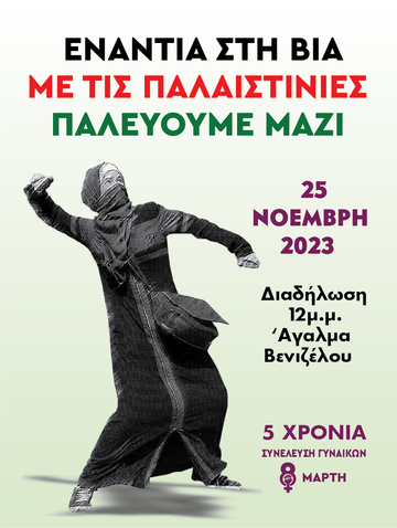 Οι αγώνες των γυναικών στην Παλαιστίνη και των γυναικών στην Ελλάδα δεν είναι παράλληλοι αλλά διασταυρώνονται, στη μάχη κατά της βίας και της φτώχειας της καταστολής και της θανατοπολιτικής των συνόρων. Η ανοιχτή στήριξη της ελληνικής κυβέρνησης στο Ισραήλ σημαίνει φρεγάτες υποστηρικτικές στην εισβολή, παρακολουθήσεις Παλαιστινίων εξόριστων και προσφύγων στη χώρα μας, συλλήψεις Ελλήνων και ξένων επειδή κρατούν τη σημαία της Παλαιστίνης, απαγόρευση εξόδου Αράβων προσφύγων από τα στρατόπεδα υπό το φόβο τρομοκρατικών ενεργειών και ενίσχυση της φύλαξης των συνόρων. Αυτή η μιλιταριστική πρακτική που ενισχύεται με τη τρομολαγνεία στα δελτία των ειδήσεων, έχει σαν αποτέλεσμα τις βίαιες επαναπροωθήσεις στο Αιγαίο που είχαν ως αποτέλεσμα τη μαζική δολοφονία εκατοντάδων μεταναστ(ρι)ών στα ανοιχτά της Πύλου το καλοκαίρι, τις βίαιες δολοφονίες εφήβων Ρομά από σφαίρες αστυνομικών, και τη συγκάλυψη σε υποθέσεις trafficking και βιασμού γυναικών. Έχει σαν αποτέλεσμα και την άνοδο των φασιστών.