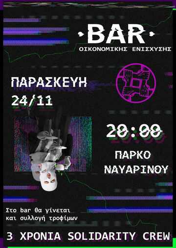 Η Ομάδα Αλληλεγγύης Αστέγων γιορτάζει 3 χρόνια λειτουργίας και διοργανώνει μπαρ οικονομικής ενίσχυσης στο πάρκο Ναυαρίνου, την Παρασκευή 24 Νοεμβρίου στις 8 μμ.