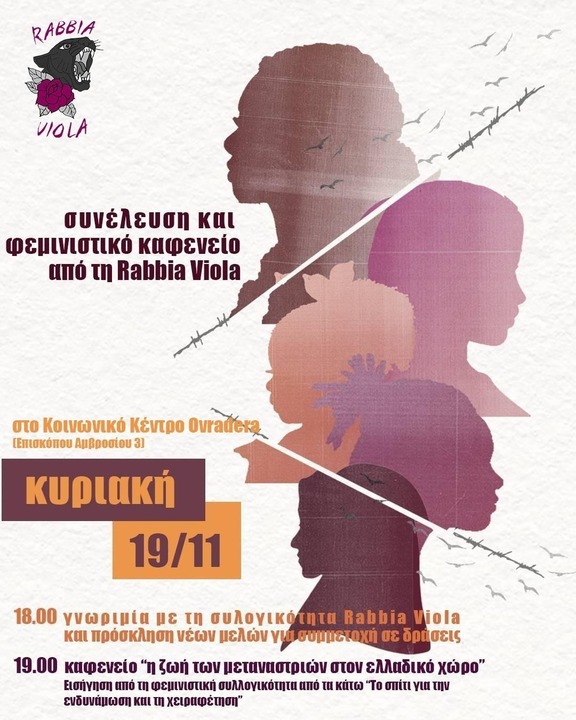 Κατά τη διάρκεια του καφενείου θα γίνει εισήγηση και από τη φεμινιστική συλλογικότητα από τα κάτω "το σπίτι για την ενδυνάμωση & χειραφέτηση" καθώς και προβολή βίντεο από αγώνες σε κέντρα κράτησης.