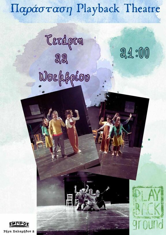 ΤΕΤ. 22/11 ΕΜΠΡΟΣ- ώρα 21.00- Η ομάδα αυτοσχεδιαστικού θεάτρου ''Playback Ground'' συνδημιουργεί μια παράσταση με τις ιστορίες των θεατών δίνοντας μορφή στο απόσταγμα της καθημερινότητας. Τι είναι το Playback? Το playback είναι είδος αυτοσχεδιαστικού θεάτρου στο οποίο δεν υπάρχει συγκεκριμένο σενάριο και σκηνοθεσία και όπου πρωταγωνιστές είναι το ίδιο το κοινό μέσα από τις ιστορίες του. Πώς γίνεται μια παράσταση Playback? Ο συντονιστής αποτελεί τον δίαυλο επικοινωνίας μεταξύ του κοινού και των ηθοποιών, οι οποίοι μαζί με τους μουσικούς αυτοσχεδιάζουν μέσα από κάποιες φόρμες του Playback. Πώς συμμετέχω σε μια παράσταση Playback? Στο Playback περισσότερο από συμμετέχω θα λέγαμε συνδιαμορφώνω μια παράσταση, καθώς οι δικές μου ιστορίες, βιώματα και προβληματισμοί είναι αυτά που θα συμπληρώσουν το νήμα από της ιστορίες των άλλων και θα αποτελέσουν το «σενάριο» της παράστασης. Πού στοχεύει μια παράσταση Playback? Στην επικοινωνία και σε ό,τι προκύψει για τον καθένα μας μέσα από αυτή. Πότε είναι η κατάλληλη στιγμή να μιλήσω ως θεατής? Όταν νοιώσω τον συνειρμό μου ή το συναίσθημα μου να με σπρώχνει στη δικιά μου ιστορία.