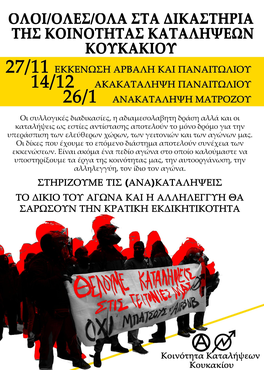 Καλούμε τον κόσμο να στηρίξει με την παρουσία του τα δικαστήρια της Κοινότητας Καταλήψεων Κουκακίου που θα πραγματοποιηθούν στις: