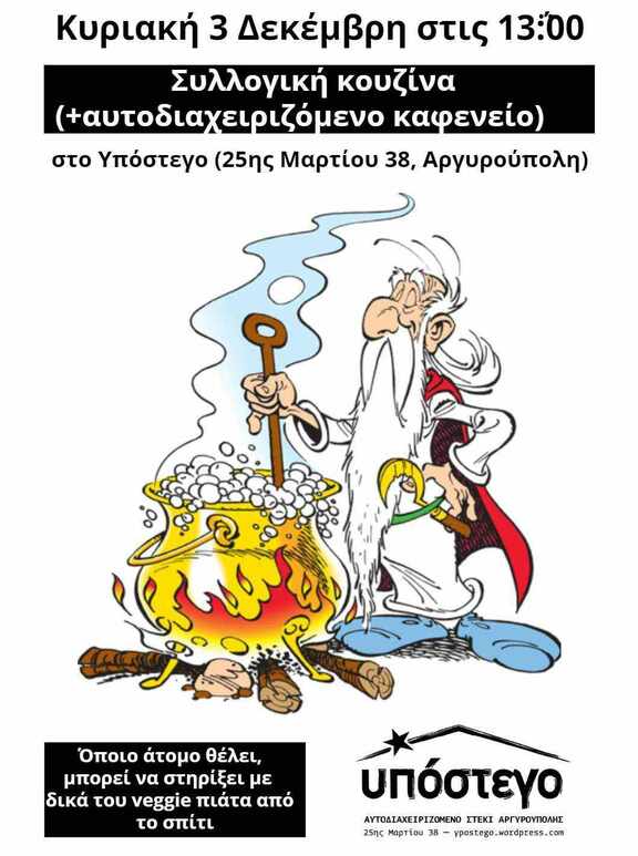 Την Κυριακή 3 Δεκεμβρίου, άνοιγμα του στεκιού με συλλογική κουζίνα και αυτοδιαχειριζόμενο καφενείο. Μαζευόμαστε, μαγειρεύουμε, εμπλουτίζουμε την κουζίνα με veggie φαγητά από το σπίτι και τρώμε όλοι/ες/α μαζί.
