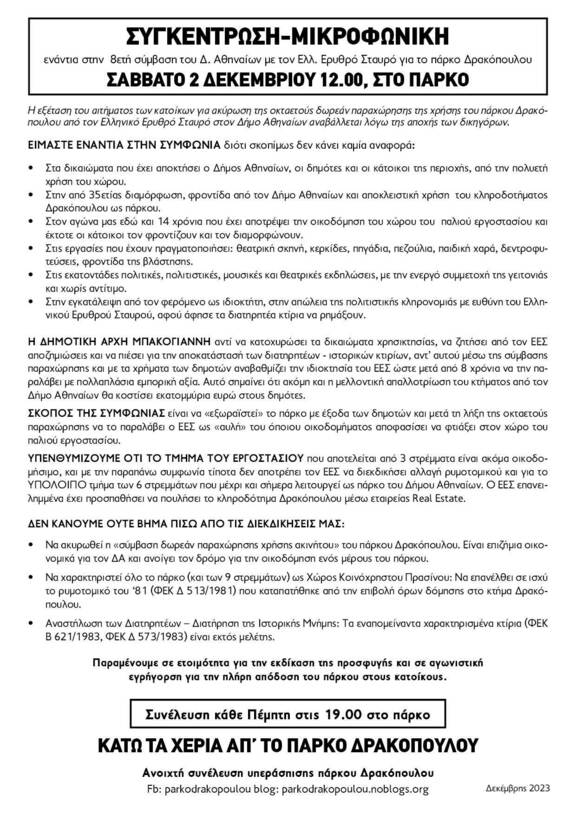 Συγκέντρωση - Mικροφωνική στο πάρκο ενάντια στην 8ετή σύμβαση του Δ. Αθηναίων με τον Ερ.Σταυρό για το πάρκο Δρακόπουλου