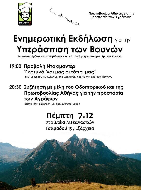 Η Συλλογική κουζίνα Elchef και η Πρωτοβουλία Αθήνας για την Προστασία των Αγράφων διοργανώνουν ενημερωτική εκδήλωση για την Υπεράσπιση των Βουνών