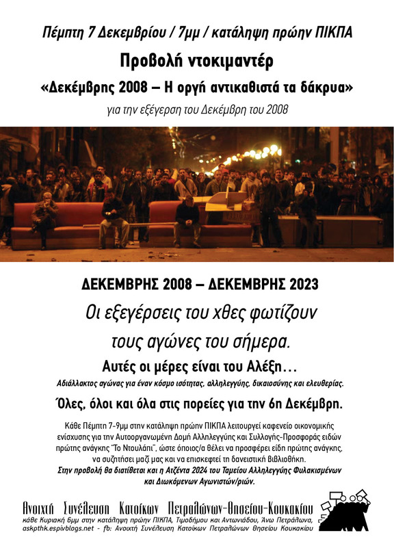 Προβολή ντοκιμαντέρ «Δεκέμβρης 2008-Η οργή αντικαθιστά τα δάκρυα» / Πέμπτη 7 Δεκέμβρη / κατάληψη πρώην ΠΙΚΠΑ / 7μμ