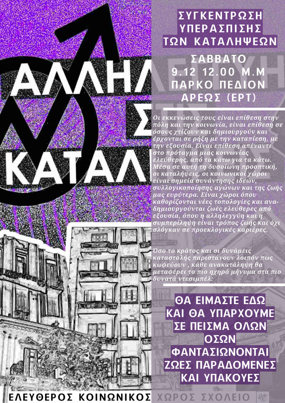 Οι εκκενώσεις τους είναι επίθεση στην πόλη και την κοινωνία, είναι επίθεση σε όσους χτίζουν και δημιουργούν και έρχονται σε ρήξη με την καταπίεση, με την εξουσία. Είναι επίθεση απέναντι στο πρόταγμα μιας κοινωνίας ελεύθερης, από τα κάτω για τα κάτω. Μέσα σε αυτή τη δυσοίωνη προοπτική, οι καταλήψεις, οι κοινωνικοί χώροι είναι σημεία συνάντησης ιδεών, συλλογικοποίησης αγώνων και της ζωής μας ευρύτερα. Είναι χώροι όπου καθορίζονται νέες τοπολογίες και ανα-δημιουργούνται ζωές ελεύθερες από εξουσία, όπου η αλληλεγγύη και η συμπερίληψη είναι τρόπος ζωής και όχι σλόγκαν σε προεκλογικές καριέρες.