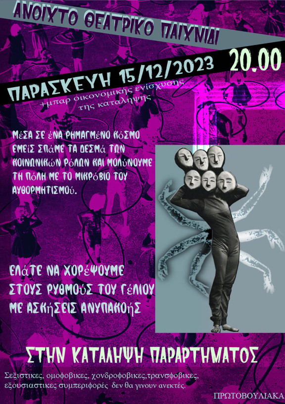 Μία απόπειρα αναγέννησης της χαμένης μας παιδικότητας. Μέσα σε ένα ρημαγμένο κόσμο σπάμε τα δεσμά των κοινωνικών ρόλων και μολύνουμε την πόλη με το μικρόβιο του αυθορμητισμού. Ελάτε να χορέψουμε στους ρυθμούς του γέλιου με ασκήσεις ανυπακοής.