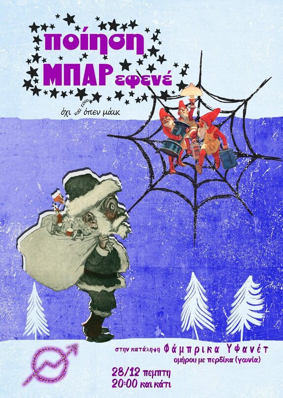 Συνήθως γράφουμε/λέμε ποιήματα. Σήμερα κανουμε ένα κόζυ μπαρ ενίσχυσης της συνέλευσης μας με μουσική, ποτό, γκλουβάιν και με ολόζεστες σόμπες. Και που ξέρετε, μπορεί να πούμε και κανένα ποίημα. Τα λέμε στην κατειλειμενη Φάμπρικα Υφανέτ, κατά τις 8 και κάτι.