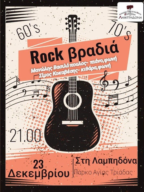 Αυτό το Σάββατο 23 Δεκεμβρίου, έχουμε στη Λαμπηδόνα Rock βραδιά με τραγούδια των 60's και των 70's, με τους Μανώλη Βασιλόπουλο, πιάνο/φωνή και Σίμο Κακαβέση, κιθάρα/φωνή. Είσοδος όπως πάντα ελεύθερη, ώρα έναρξης: 9 μμ.