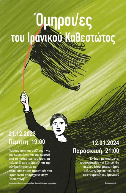 Παρουσίαση και συζήτηση που αφορά την καταπίεση και την κατοχή από το καθεστώς του Ιραν, τα πολιτικ@ κρατούμεν@ και την σύνδεσή τους με τις αποικιοκράτες πρακτικές του Ισραηλινού απαρτχάιντ στην Παλαιστίνη.
