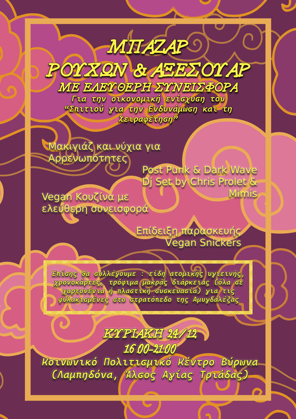 Την Κυριακή 24 Δεκεμβρίου από τις 16:00 ως τις 21:00 θα πραγματοποιηθεί στον χώρο του Κοινωνικού Πολιτιστικού Κέντρου Βύρωνα (Λαμπηδόνα, άλσος Αγίας Τριάδας) μπαζάρ ρούχων και αξεσουάρ με ελεύθερη συνεισφορά για την οικονομική ενίσχυση των δράσεων της φεμινιστικής ομάδας "Σπίτι για την Ενδυνάμωση και τη Χειραφέτηση". Περισσότερες πληροφορίες για το σκεπτικό και τις δράσεις της ομάδας μπορείτε να βρείτε ακολουθώντας αυτούς τους συνδέσμους: https://www.instagram.com/to_spiti_, https://www.facebook.com/spiti.gynaikon, https://www.thehouseofwomen.info/.