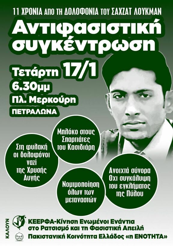 3) Συμμετέχουμε στην διαδήλωση για τα 11 χρόνια από τη δολοφονία του μετανάστη εργάτη Σαχζατ Λουκμαν από χρυσαυγιτες στα Πετράλωνα 17/01 6:30 Πλατεία Μερκούρη.
