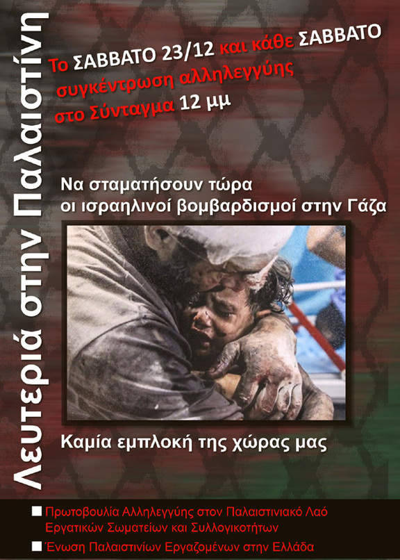 Αντιλαμβανόμενοι την αλληλεγγύη στην πάλη του παλαιστινιακού λαού για τη λευτεριά του ως κεντρικό επίδικο της διεθνούς και εγχώριας ταξικής πάλης, καλούμε σε επαγρύπνηση και επιφυλακή όλες τις εργατικές, λαϊκές, νεολαιίστικες δυνάμεις μπροστά στις εξαιρετικά επικίνδυνες εξελίξεις που ανοίγει η ένταση της ιμπεριαλιστικής- σιωνιστικής εκστρατείας στην Παλαιστίνη και τη Μ. Ανατολή και η συμμετοχή του ελληνικού κράτους σε αυτήν στον γνώριμο ρόλο του καλού και πρόθυμου στρατιώτη των ΗΠΑ και του Ισραήλ, στο ρόλο του οπλισμένου χεριού του ιμπεριαλισμού και του ελληνικού κεφαλαίου.