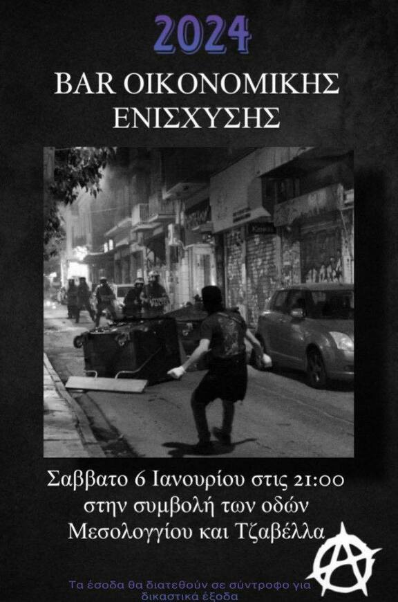 Μπαρ οικονομικής ενίσχυσης για δικαστικά έξοδα συντρόφου το Σάββατο 6/1 21:00 στον πεζόδρομο της Μεσολογγίου