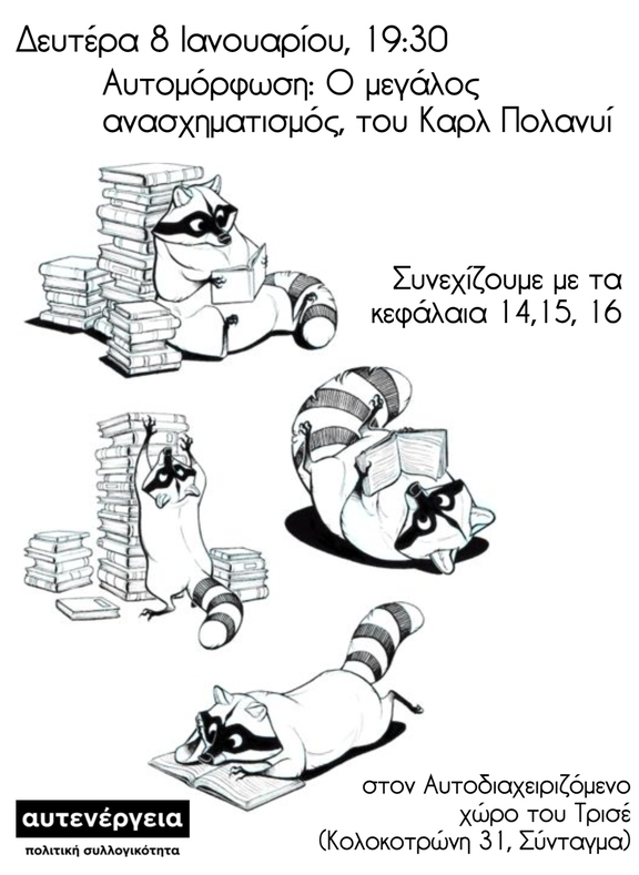 Την Δευτέρα 8/1 στις 19:30 θα πραγματοποιηθεί στο χώρο μας στο Τρισέ η πρώτη συνάντηση του κύκλου αυτομόρφωσης για το νέο έτος, του βιβλίου του Καρλ Πολανυί, ο μεγάλος ανασχηματισμός.