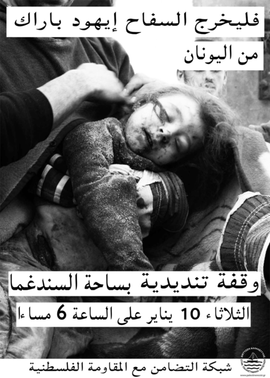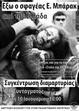 Τη Τρίτη στις 10 Ιανουαρίου έρχεται στην Αθήνα για επίσκεψη ένας ακόμα σφαγέας του παλαιστινιακού λαού, ο υπουργός πολέμου του Ισραήλ Εχούντ Μπάρακ. Θεωρούμε την επίσκεψή Μπάρακ πρόκληση για τα αισθήματα φιλίας και αλληλεγγύης που τρέφει ο ελληνικός λαός για τον αδελφό παλαιστινιακό λαό.