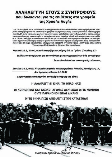 Τη Δευτέρα 29 Ιανουαρίου στο Α' τριμελές εφετείο κακουργημάτων Αθηνών στη Λουκάρεως εκδικάζεται η υπόθεση των δυο αντιφασιστών συντρόφων που κατηγορούνται για επιθέσεις σε γραφεία της ναζιστικής οργάνωσης Χρυσή Αυγή. Παρά την αποχή των δικηγόρων, η μαζική παρουσία κόσμου κρίνεται απαραίτητη καθώς αναμένεται να παρελάσει πλήθος δεκάδων μαρτύρων κατηγορίας, μεταξύ των οποίων στελέχη της Χρυσής Αυγής και μπάτσοι. Επίσης, οι δυο σύντροφοι θα αιτηθούν την αλλαγή των δυσβάστακτων περιοριστικών όρων που τους έχουν επιβληθεί και η παρουσία συντροφισσών και συντρόφων που θα τους στηρίξουν είναι χρήσιμοι. Γι αυτούς -και για όλους τους λόγους του κόσμου- τη Δευτέρα όλες και όλοι στις 9:00 στο εφετείο (Λουκάρεως 14, 4ος όροφος, αίθουσα Δ 100 Β').